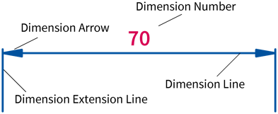 The following image shows the different elements of a distance dimension and their names. These names are also equally valid for other dimension forms: